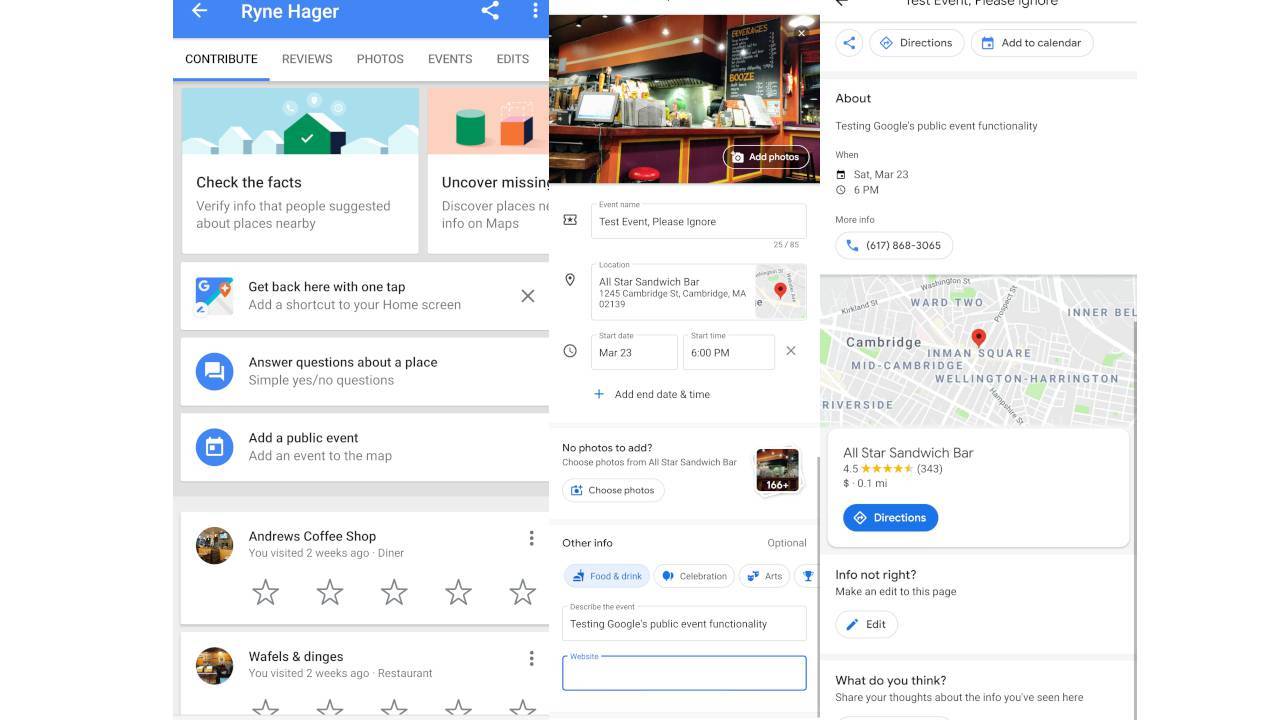 Deberás acceder en el costado superior derecho, donde están las opciones de la aplicación, e inmediatamente seleccionar la opción«tus contribuciones» para luego acceder al apartado «agregar evento público», para que desde ahí los usuarios puedan crear sus eventos y luego hacerlos públicos.
